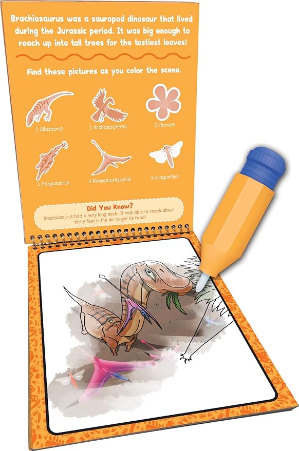 Embark on a playful journey back in time with your little ones using Dinosaurs Water Reveal. Let their imaginations run wild as they uncover a variety of dinosaurs in a prehistoric world. No more mess with markers or crayons, just use the refillable water pen to color and repeat the fun! Each board features interactive search-and-find activities and educational facts about dinosaurs, making learning hands-on and exciting. With 4 reusable picture boards and a refillable water pen, the adventure never has to end - making it both entertaining and eco-friendly.