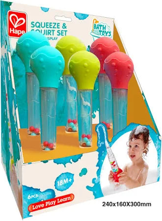 Squeeze & Squirts means three times the fun! Fill these cool bath toys with water and watch the beads inside dance about. Then squeeze the bulb for a cool water spout!