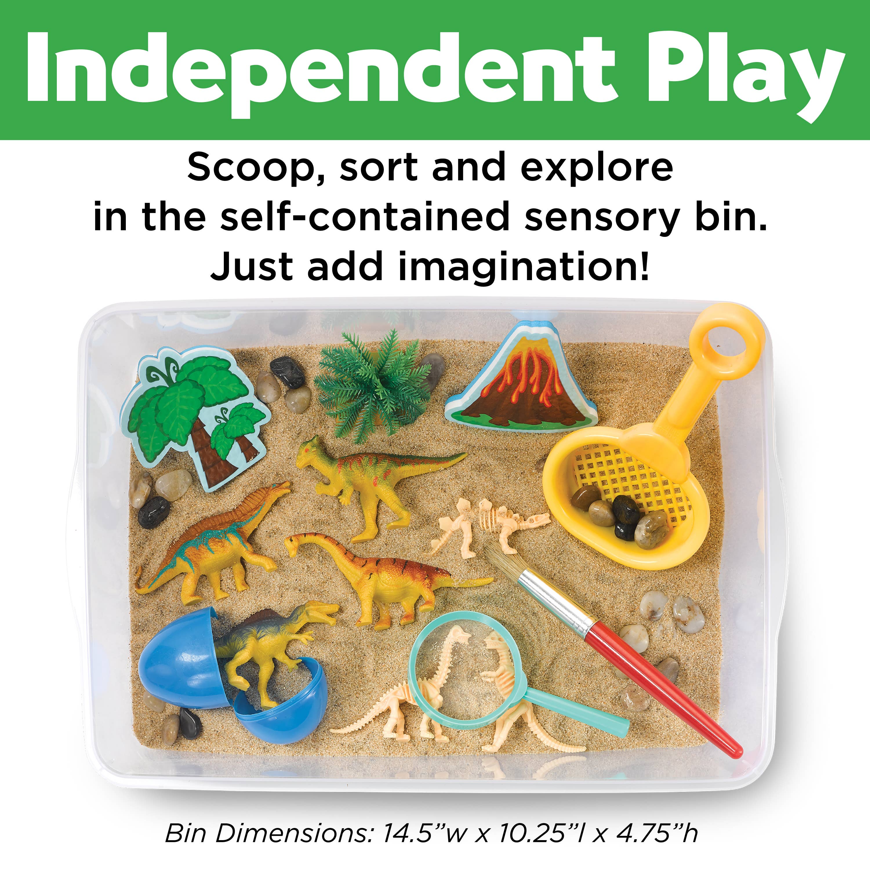 Go on a dinosaur adventure while engaging your sense of touch with a dinosaur themed sensory bin! Play with sensory sand, faux plants and dino skeletons to build fine motor skills and promote sensory development Parents and children can enjoy hours of imaginative play together! Complete cognitive tasks found in the illustrated instructions like “Count the items inside the bin” to encourage thought, perception and knowledge in your child Place your self-contained bin on a towel to prevent mess while you are scooping, digging and playing with the included sensory materials! Hands-on play is a great way to prepare your child for preschool! While on a prehistoric adventure your children will learn to explore, create and engage When your family is done playing and engaging with the sensory bin, upcycle it by planting flowers or storing small toys and keepsakes inside, crafters can also recycle their bin to do their part in saving our Earth!