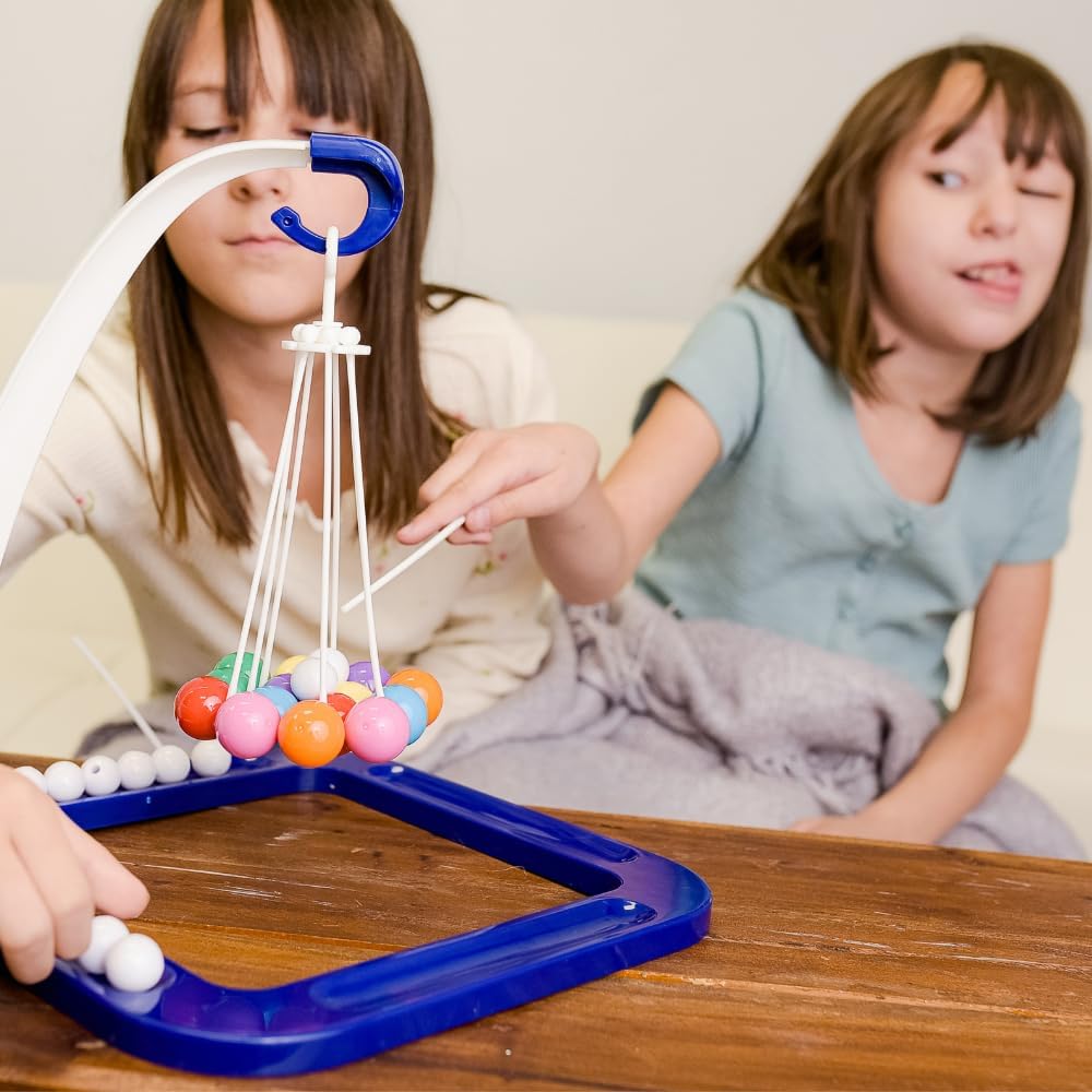 Using precision and dexterity, players carefully take turns, placing beads, one by one, on top of the colored ball cluster. As weight increases, causing the cluster to slowly separate, it becomes more and more likely that the beads may fall through the cracks. Keep a steady hand, remain calm and carefully consider where to place your beads or else you’ll make everything…TUMBALL!
