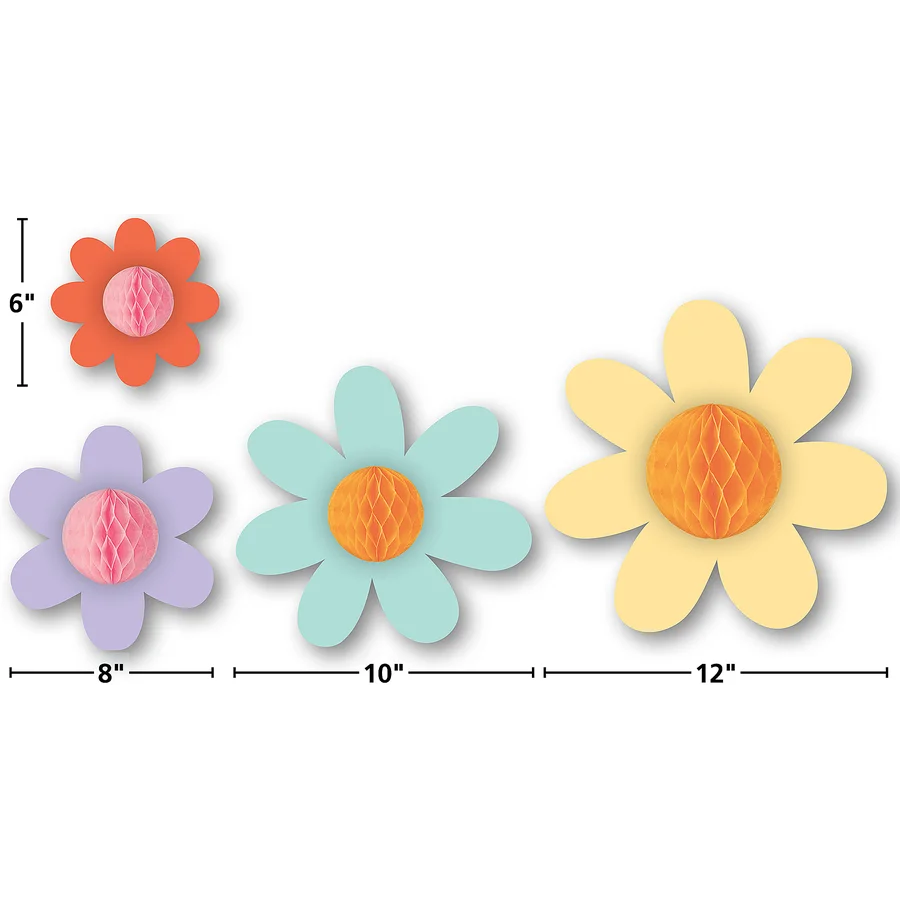 Accents in assorted sizes with coordinating honeycomb balls! Effortlessly brighten your space with these 3D Honeycomb Accents. Display your flowers on walls, bulletin boards, or classroom displays!