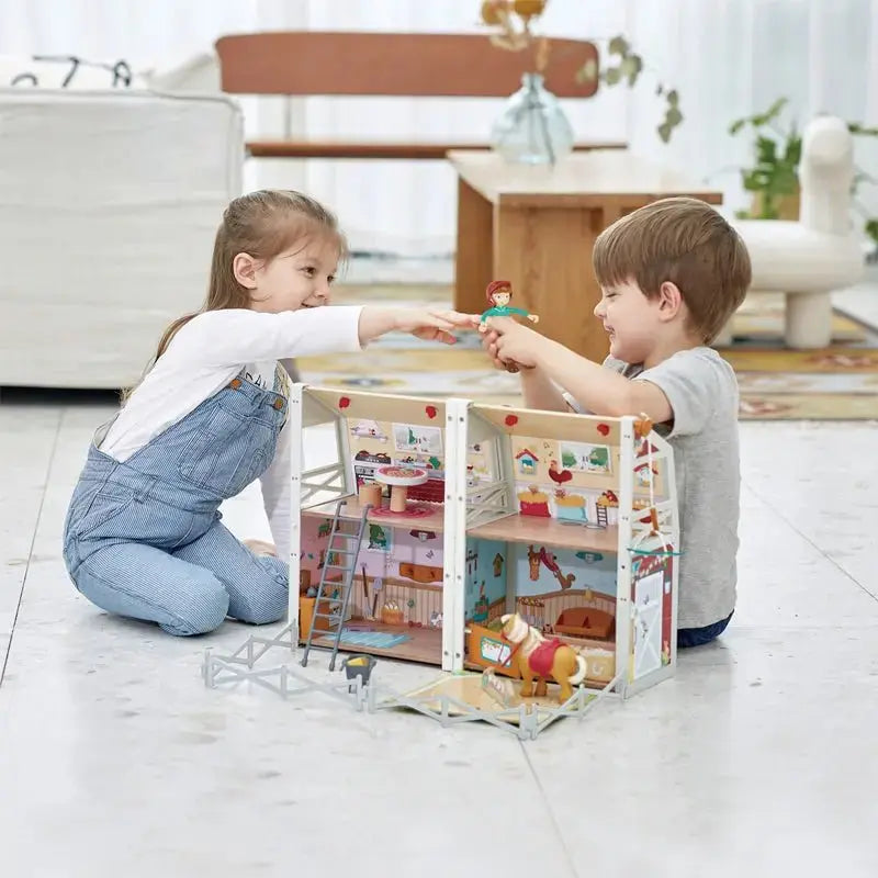 This compact easy-to-store stable comes with 2 levels and loads of grooming and riding accessories. 25 pieces are included in this playset. Welcome to The Pony Club Ranch. This playset is sure to bring adventure to your little wrangler with so many ranch activities! Upstairs is a living area with a kitchen where your wrangler can rest after a long day of riding. The toy dolls are constructed from plastic material that provides long-lasting durability and years of play.