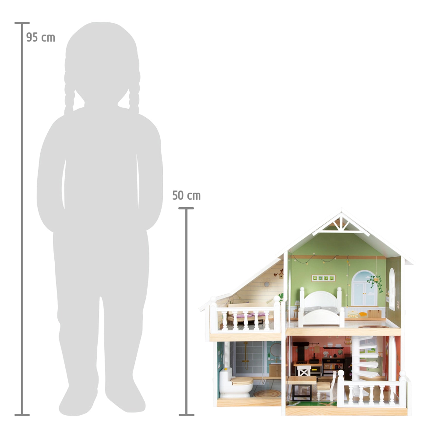 This modern wooden dollhouse with an open front makes a fantastic impression with artistic details, decorative accents, and a modern interior style. A combined kitchen, living room, and dining room, a bedroom, and a bathroom as well as a rooftop terrace and a front garden offer boundless possibilities for imaginative play and active role play. The open living concept, the winding staircase, and windows that open, and a modern floor-level shower with a wall made of Plexiglass come together with eight functional pieces of furniture and textile elements such as bed linens and pillows to make a lovely eye-catcher in the nursery. The highlights of this dollhouse are the large rooftop terrace with seats and banisters, the toilet with an openable seat cover, and kitchen cabinets and a refrigerator with doors and drawers for a particularly realistic playtime experience. for ages: 3Y+