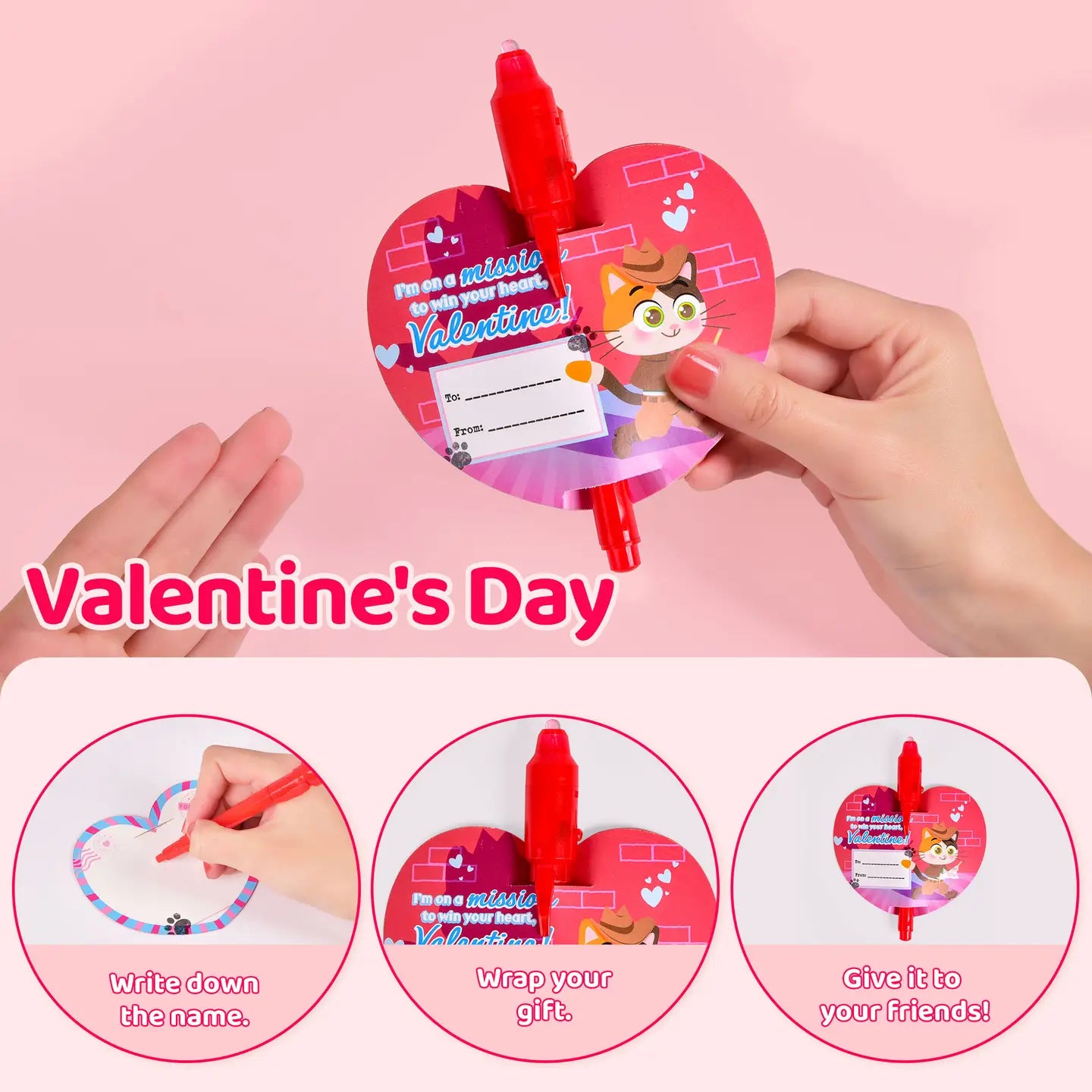 Spread love and laughter this Valentine's Day with our 28 Pack Invisible Ink Pens & Cards! Our spy pen cards feature 7 unique designs and vibrant pens for a playful celebration. Write secret messages and watch them magically appear with built-in LED lights. Safe for kids and perfect for heartfelt notes, these pens add a fun twist to your Valentine's Day festivities.