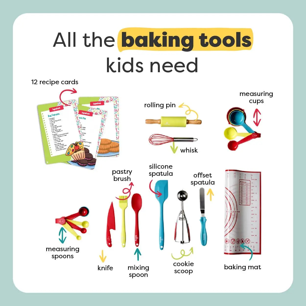 Get your little ones baking with Baketivity's 31-piece kids' cooking set. With safe and fun tools, this set empowers children to learn and have a blast in the kitchen. From planning, following instructions, and kitchen safety, to exploring tastes and textures, this set teaches important cooking techniques. Includes metal whisk, mixing spoon, offset spatula, and more.