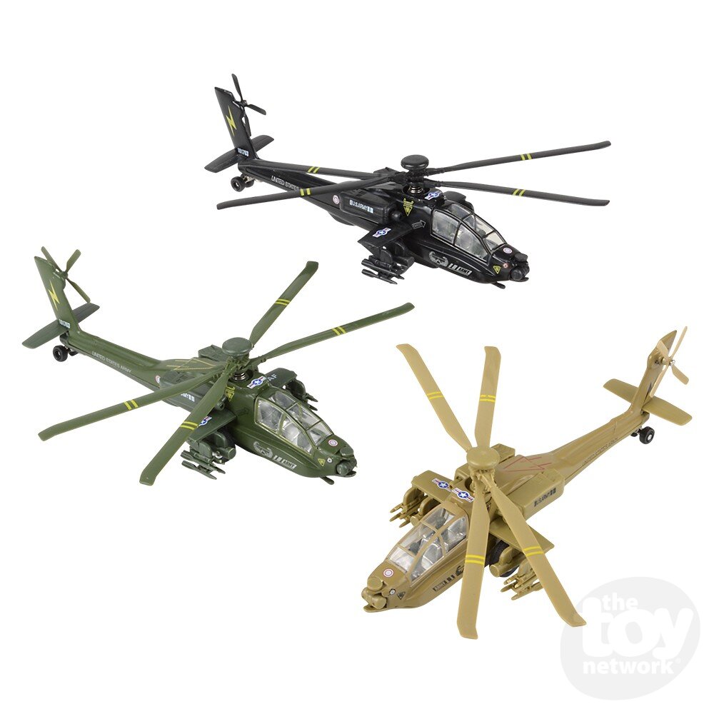 This 8” diecast pullback apache helicopter is patrolling the skies!. Each helicopter comes with 4 propellers. Helicopters are made of sturdy diecast metal. Colors vary, you will receive one chosen at random.