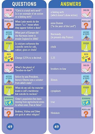 Brain Quest 7th Grade Smart Cards helps kids aged 12 – 13 to learn core classroom subjects in a smart, entertaining, and engaging way. It’s a Q&A game that seventh graders can play with friends, family, or against the clock to test their knowledge. Smart cards feature hundreds of questions with answers to help kids know exactly what they need to know, when they need to know it.