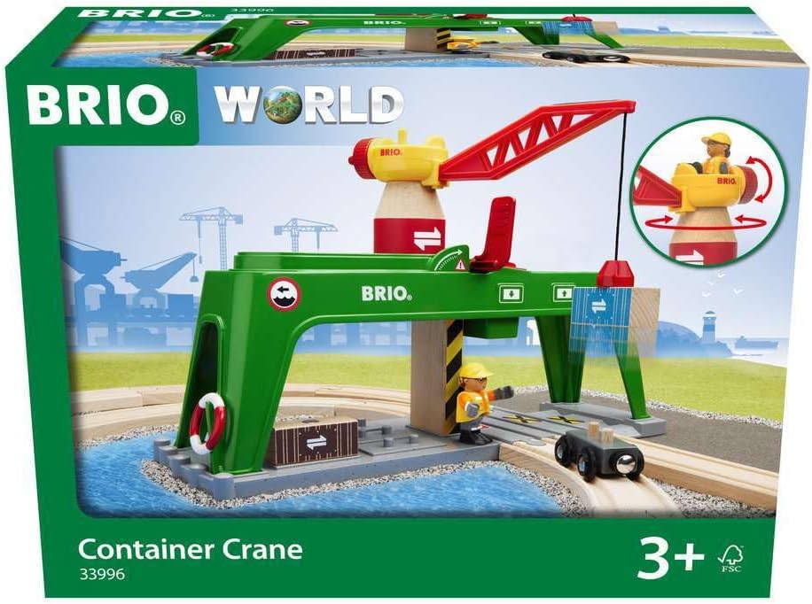 Explore the Brio Container Crane's magnetic hook, lifting and dropping containers onto train tracks for an engaging playtime experience. Made with responsibly sourced materials, this toy supports forest conservation and fights climate change. Children will develop fine motor skills while playing with the realistic construction and railway features. It's a perfect addition to any Brio World set and suitable for kids 3 and up.