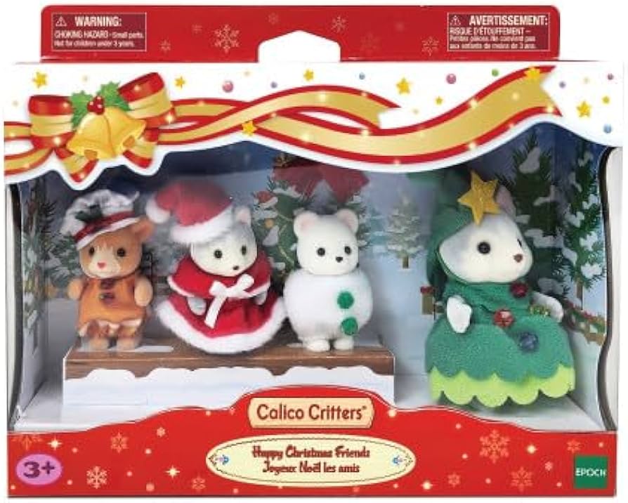 Get ready for a jolly holiday season with the Calico Critters Happy Christmas Friends! This limited edition set includes 4 adorable collectible dolls in festive costumes, perfect for playtime traditions. Dress up Husky sister Pauline as a Christmas tree, put Little Husky baby Linnea in a Santa suit, transform Polar Bear baby Yana into a cute snowman, and turn Reindeer baby Eve into a delicious gingerbread cookie. These fun and removable costumes can also be mixed and matched with other child and baby size Calico Critters figures. Embark on holiday adventures with the whole Calico Critters gang, whether playing independently or with the help of Calico Critters dollhouses, furniture, and accessories.