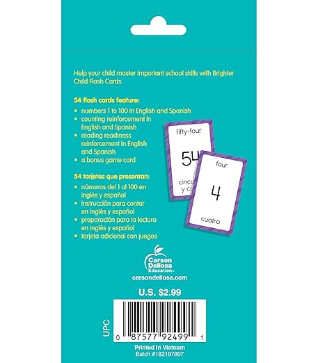 Kids learn primary phonics and math skills, learning to read, spell, and count numbers 1 to 100 in English and Spanish. The kindergarten flash cards are made with a glossy cardstock finish and rounded edges for easy flipping and sorting. The bonus resource cards feature additional games for even more English and Spanish learning fun!