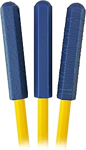 Chewberz by The Pencil Grip are prism-shaped chewy pencil toppers that feature a closed rounded top; a discreet new chewy tool that's great for self-regulation and focusing oral sensory input. These chewable pencil toppers are latex free. This inexpensive oral motor set includes 3 chewy fidget toppers in 3 assorted textures: smooth, dotted, and ridged. These latex-free pencil toppers come in a neutral navy color and fit standard-size pencils and pens. The navy blue pencil toppers are designed for mild to moderate chewers from ages 5 to adults. This pack contains 3 pencil toppers.