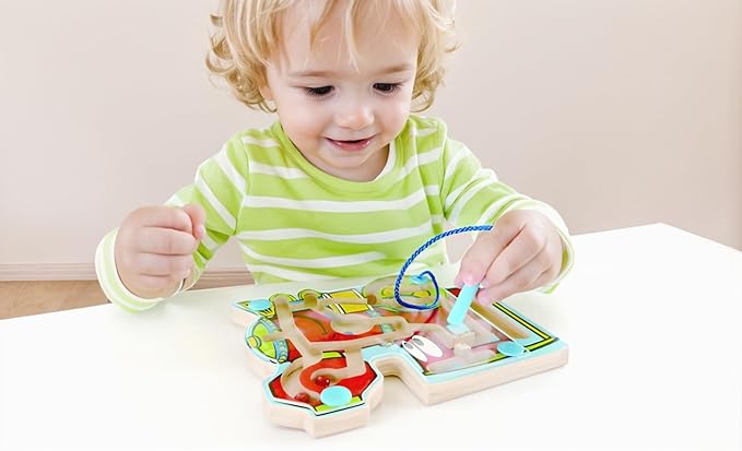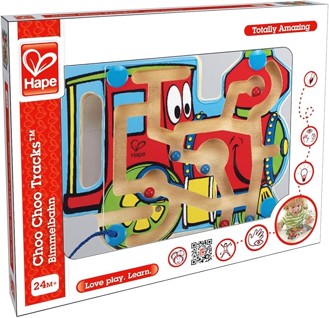 LET'S PLAY: Use the attached magnetic wand to guide the beads through the train maze and drop them into the wheels. DEVELOP MULTIPLE SKILLS: This STEM toy is perfect for developing fine motor dexterity, visual spatial skills, counting, and color learning in one fun activity. ENCLOSED PLASTIC COVER: Features a carrying handle, and a fixed, clear plastic cover, keeping the beads safely secured for your convenience. Made with sturdy wooden materials and a transparent plastic cover, this maze puzzle is safe for little hands to play with. PERFECT GIFT FOR TODDLERS: Surprise your little ones with this fantastic wooden maze puzzle - the perfect birthday or Christmas gift! Guide the beads through the durable train-shaped maze, great for on-the-go fun or for play at home. No mess to clean up, thanks to the enclosed design. Non-toxic and child-safe, all Hape products are made to the highest quality standards. For ages 2 to 4.