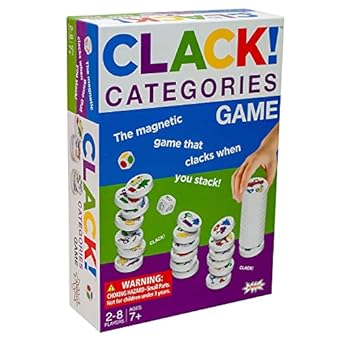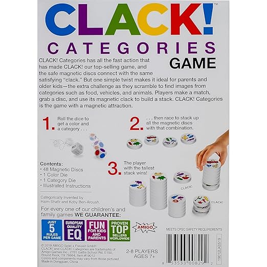 Experience the vibrant and interactive fun of CLACK! Categories Magnetic Stacking Game from Amigo Games! Roll the dice, match categories and colors, and stack magnetic discs with a satisfying "clack"! The tallest stack wins, making every turn thrilling and engaging for ages 7 and up. With constant action and engagement, every player plays on every turn, creating a lively game night atmosphere for the whole family. The game's vibrant design featuring colors and categories (such as vehicles, trees, food, animals, and symbols) adds to the excitement of matching and stacking. Easy scoring allows players of all ages to enjoy the game - simply line up the stacks to determine the tallest tower. Plus, with magnets safely sealed inside the discs, CLACK! ensures a secure play experience for everyone. Contents include 48 magnetic discs, 1 color die, 1 category die, and illustrated instructions. Perfect for 2-8 players, CLACK! is a must-have game for family game nights, playdates, and more!