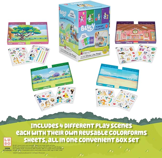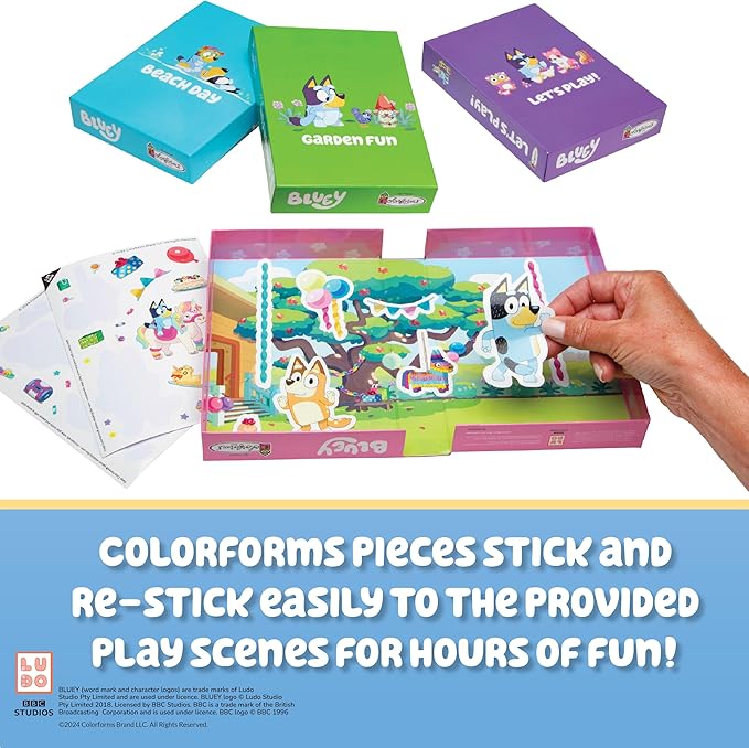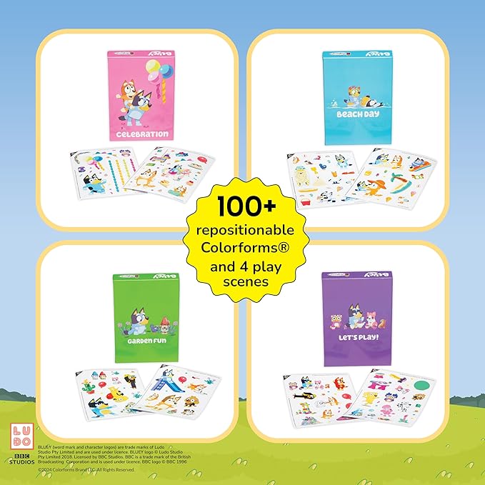 Come play with Bluey and friends in 4 delightful Colorforms scenes! Colorforms have inspired children to get creative and have fun for decades with their classic repositionable shapes that provide endless storytelling moments. Enter Bluey's world with 4 different playsets to choose from, all packaged in their own little book box so you can take it with you for fun on the go! Explore outside with Garden Fun, have a party with Celebration, make a sandcastle with Beach Day, or hang out in Bluey's room with Let's Play. Each included box comes with its own set of Bluey Colorforms sheets to match the theme, or mix and match them all for even more fun! With pieces that Stick Like Magic, it's more fun to play the Colorforms way! For children ages 3 and up.