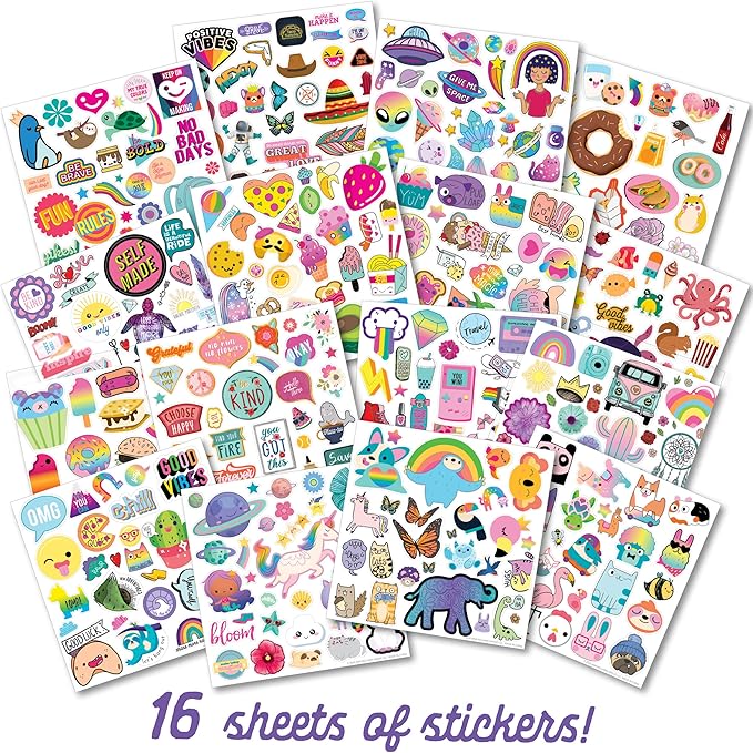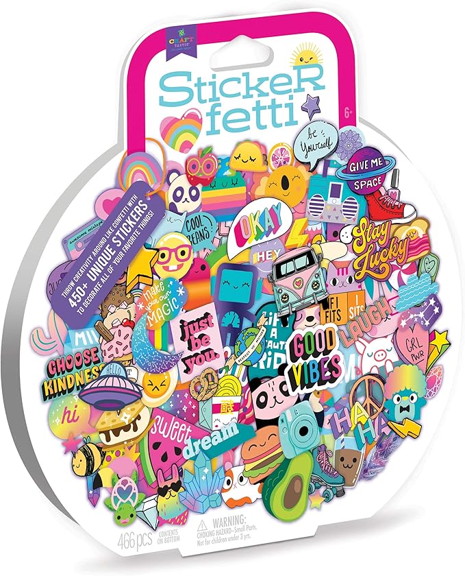 450+ STICKERS WITH COOL VSCO DESIGNS: All the best themes are included - cute animals, cute aliens, yummy food, rainbows, and much more! NO STICKY MESS, NO WORRIES: These stickers come off clean without any annoying residue. Mom approved! STICK THEM ANYWHERE: Put them on your phone case, instrument case, water bottle, locker... Show off your personality with Stickerfetti! PERFECT FOR GIFTS OR PARTIES: Stickerfetti is a great present, or have fun passing out sticker sheets as party favors. ENCOURAGES CREATIVE EXPRESSION: There are no rules here, use Stickerfetti however you want to express your individuality with top-quality, durable stickers.