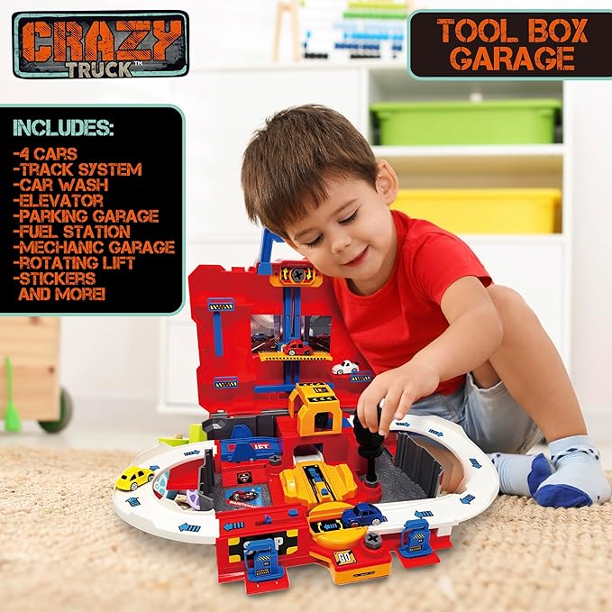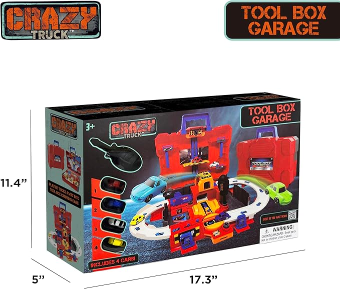 Playset with 4 cars, track system, car wash, elevator, parking garage, fuel station, mechanic garage, rotating lift, stickers, and more - all in one toolbox! Perfect for kids ages 3 and up, this fun and interactive playset is designed in the USA and safety tested to government standards. No batteries required, so kids can enjoy endless playtime wherever they go.