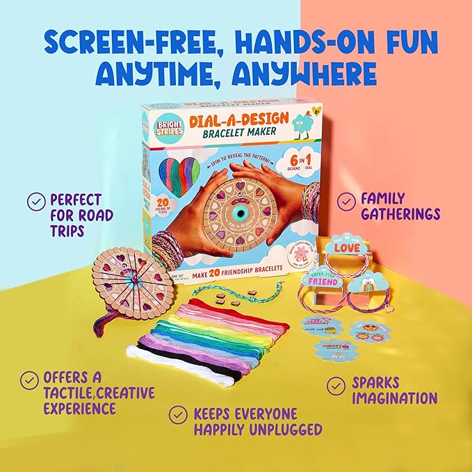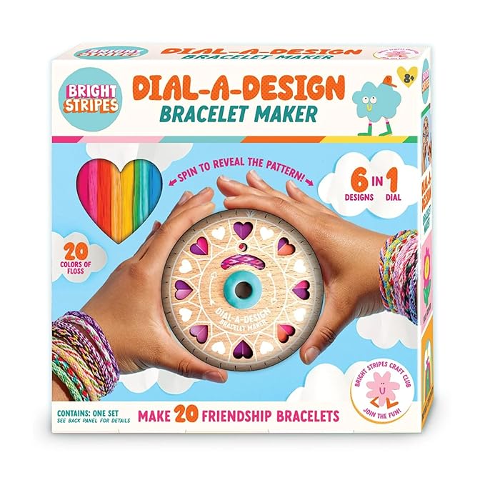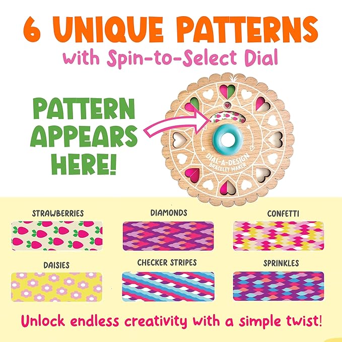 Discover the art of bracelet-making like never before with the Dial-A-Design Bracelet Maker – a premium, all-in-one kit that transforms crafting into a creative adventure! Designed with a patent-pending, easy-to-spin dial, this innovative wooden tool reveals six unique bracelet patterns, each complete with built-in color codes for effortless design guidance. Just twist to select a pattern, choose your colors, and watch as each bracelet comes to life, uniquely yours. Perfect for beginners and experienced crafters alike.