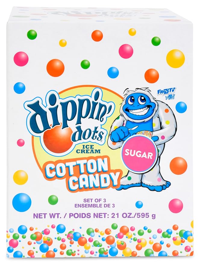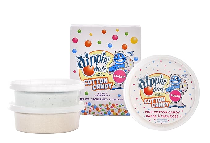 Indulge in the carnival classic - Cotton Candy! Made in the USA with three officially licensed Dippin' Dots flavors, our floss sugar comes in pink, blue, and cookies and cream. Each container holds 7 oz, or one cup, of sugar and can make approximately 15 servings. Perfect for a fun party or sleepover, get ready to spin some tasty fun at home!
