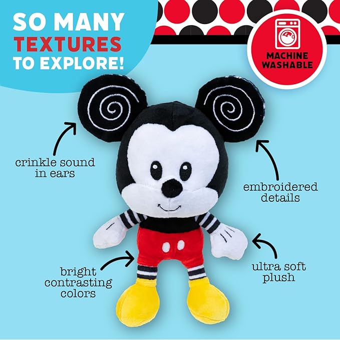 - DETAILS: This Black and White Disney Stuffed Plush animal toy stands 10" and has floppy arms and legs, crinkle in its ears, and is ultra soft as well as machine washable. Ages newborn and up.