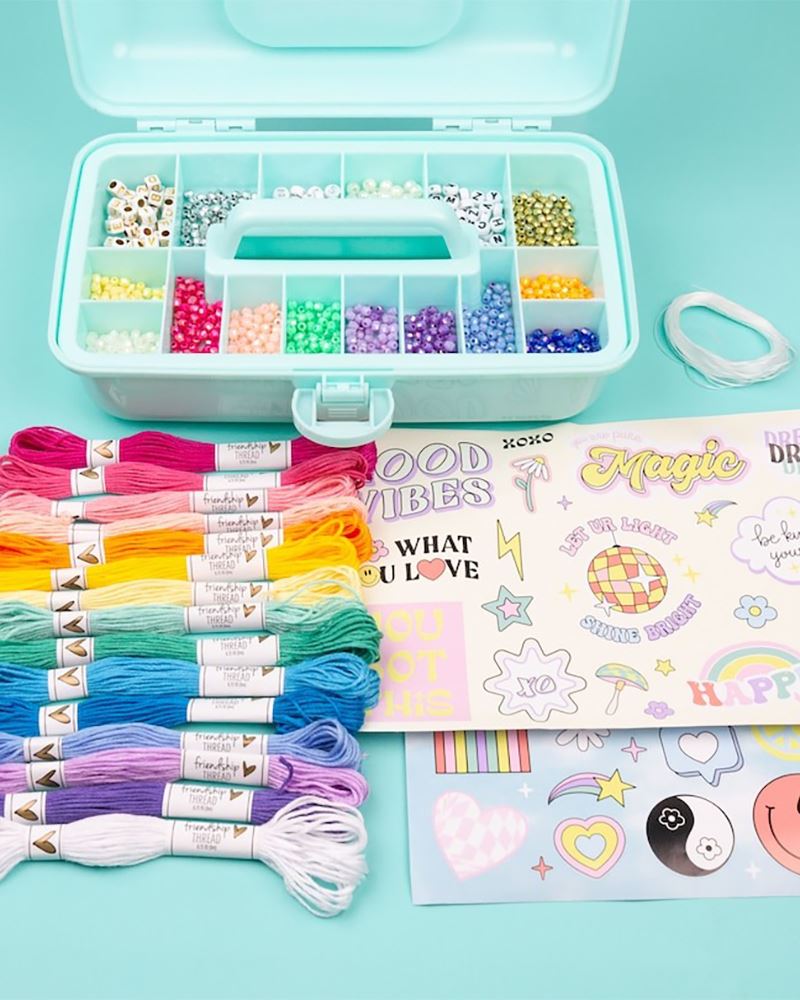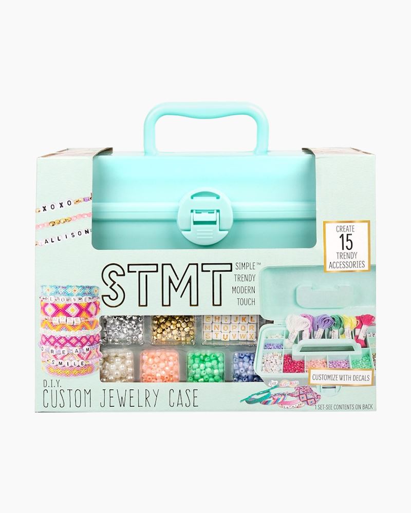 Get crafty with this DIY Custom Jewelry Case Kit! This reusable storage case features a small handle and an easy-lift latch on the front. It comes with colorful thread and a variety of beads in different finishes that you can use to create one-of-a-kind accessories. Decorate the case with the included stickers for a personalized touch! Use the alphabet beads to spell out names, phrases, or a song title.