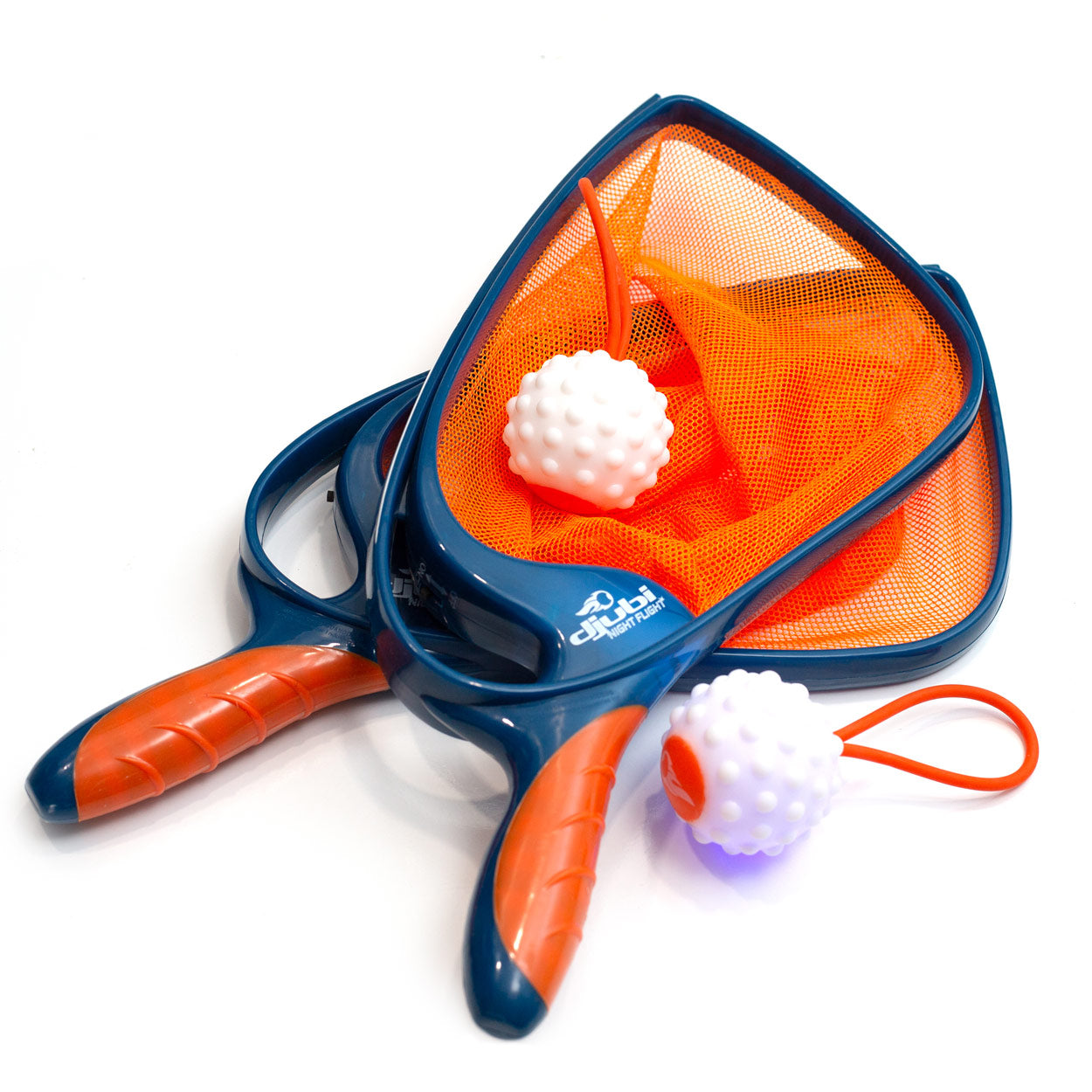 The soft gel ball streaks across the sky at night. Catch them in your light-up racquet!