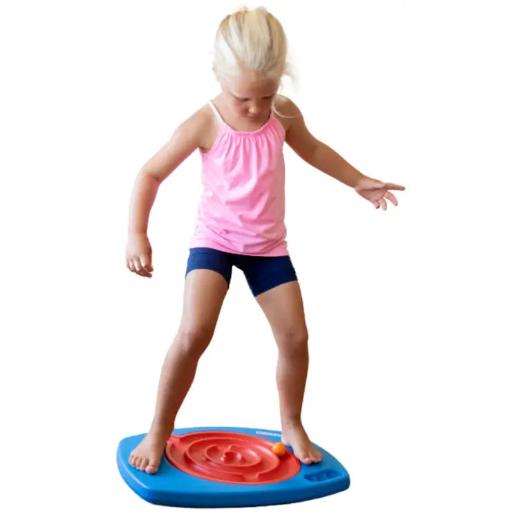 Double-sided balancing board with 3 balls to maneuver through two different mazes.