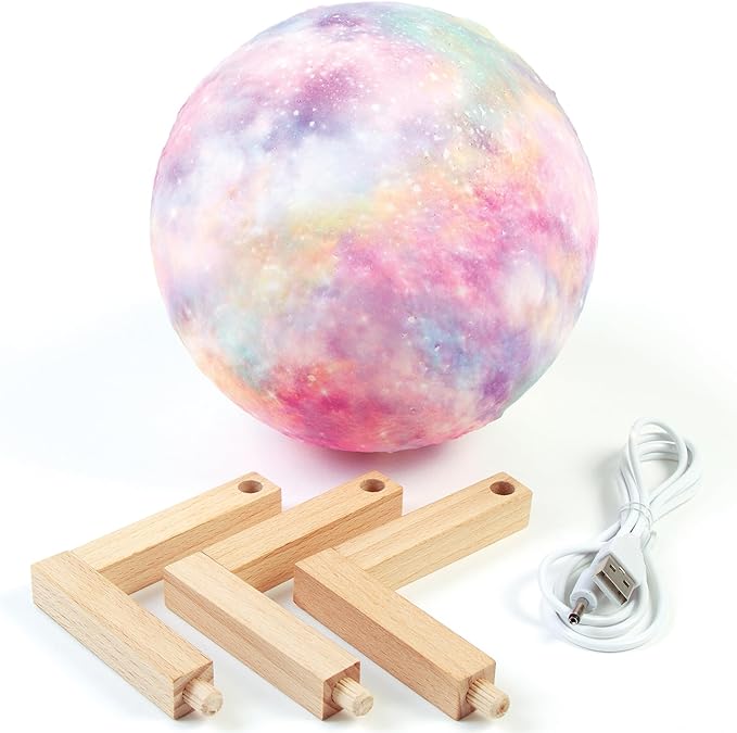 Step into a dreamy world with this Galaxy Dreams Moon Light. Let its mesmerizing glow and celestial ambiance transform any tween's space - whether it's their bedroom, study area, or relaxation zone. Just tap the moon to cycle through 3 different lighting schemes, each showcasing a unique aspect of the moon's design. Get lost in its out-of-this-world detailed design, perfect for sparking curiosity about astronomy and space exploration. At a compact 15 cm (5.9 inches) in diameter, this moon light is the perfect addition to any room and comes with a USB cord for easy powering. Compatible with standard USB ports, it's ready to light up your space with its colorful lighting effects.