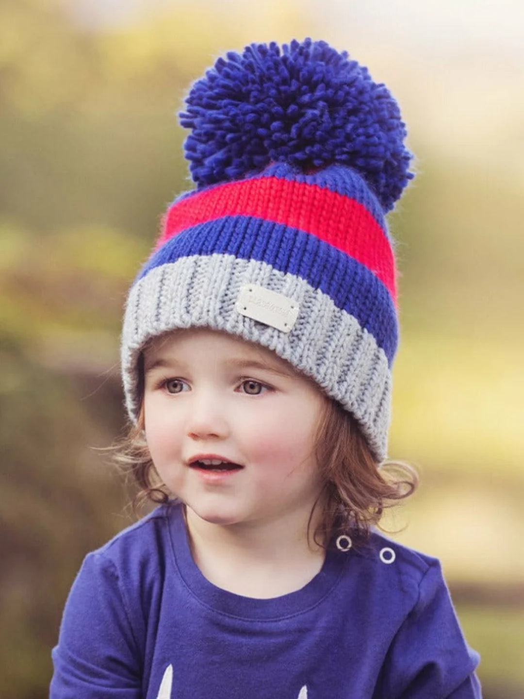 Chunky knit in red, blue and grey, with a fleece lining and finished with a large bobble.
