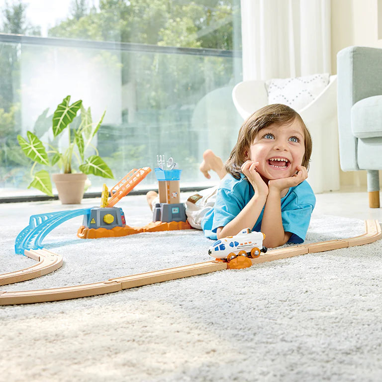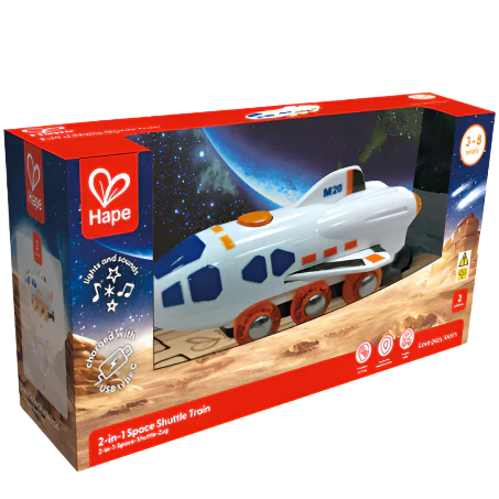 Take playtime to new heights with the Hape 2 in 1 Space Shuttle Train! This unique toy combines the classic fun of a train with an out-of-this-world twist. Compatible with most wooden train tracks, it's sure to bring endless joy to your little one.