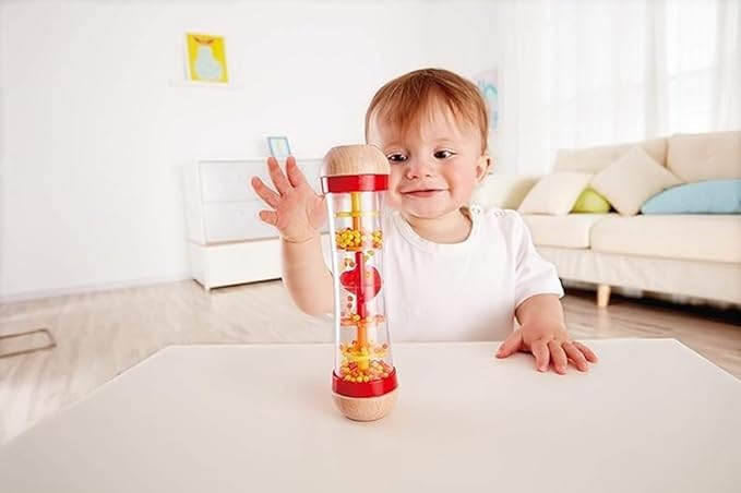 PLAYFUL RAIN DROP SOUNDS: Flip this rainmaker upside down and delight the senses with lively cascading beads and comforting rain drop melodies. A fantastic musical toy for sensory development. STRONG DESIGN: The perfect sturdy shape allows toddlers to easily grasp and transform this toy into a shaking and rattling adventure. CLEANING TIPS: Keep it clean with baby wipes, damp cloths, or moist wipes to avoid static. SAFE AND SOUND: Your little one will love playing with this durable toy, featuring a child-safe paint finish and solid wooden construction. AGE APPROVED: Recommended for kids 12 months and up, this one-of-a-kind toy is sure to bring joy for years to come.