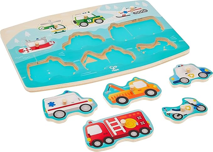 Unconventional yet timeless, this imported peg puzzle adds a twist to learning the names and types of emergency vehicles. Vibrant hues and playful shapes engage young minds, while child-safe materials ensure lasting enjoyment.