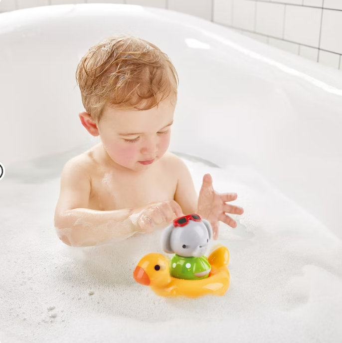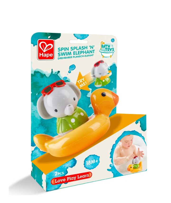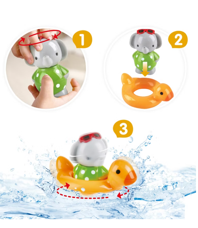 - Wind the elephant up by twisting her then place in the duck ring to spin in the water