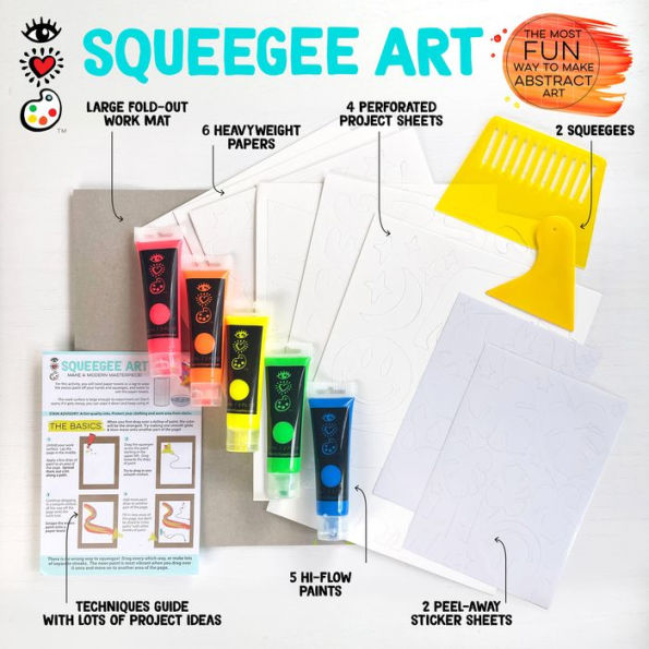 Squeegee Art brings the social media phenomenon into a kid-friendly, rich activity kit with guided projects and so much discovery. Kids of all skill levels experiment with techniques and create bold, unique artwork using the hi-flow neon paints that glide, blend and pop off the page. Peel-away stickers allow you to mask off areas of the page for cool resist effects, and lots of punch-out shapes allow for easy paper-craft projects. And as always, iHeartArt donates 5% of proceeds to our charity partner, Art Feeds, that supplies art lessons, training and art materials to kids in need.