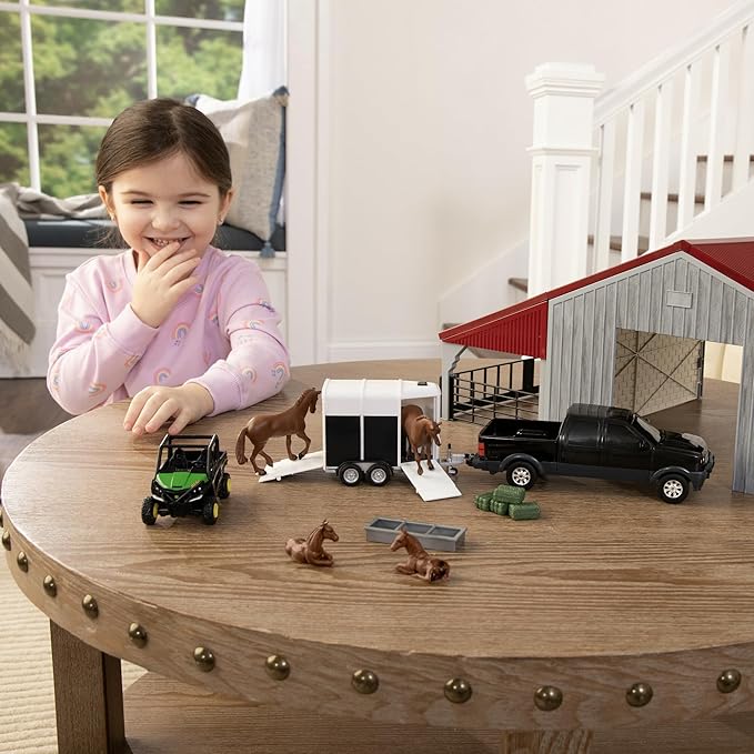 Playset: Get ready for farming fun with this 13-piece set featuring a barn, John Deere RSX 860i gator, pickup truck, horse trailer, 4 toy horses, feeder, and 4 square bales. Moving Parts: The John Deere RSX 860i Gator brings your kid's farm toys to life with a functional, tilting box for easy unloading of hay bales to feed the horses. Kid Tough: Made to withstand rough play, these sturdy farm toys are perfect for indoor and outdoor adventures. Farm Fun: Kids ages 3 and up will love this haying-themed playset as they imagine themselves in charge of the farm and caring for their horses. Officially Licensed John Deere Gator: Produced by the experts at ERTL, who have been creating farm toys and authentic replicas for nearly 80 years.