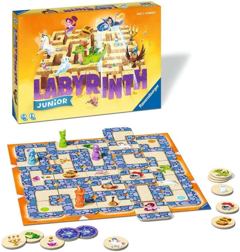Race for treasures in a moving maze with Labyrinth, an international classic for over 35 years! On your turn, you'll shift the maze, then move towards the treasures or magical creatures on your cards. The first player to find all of the treasure on their cards and make it back to their starting point wins. No two games are alike! In this Junior version, the maze is smaller and tiles are larger to make playing easier for younger players.