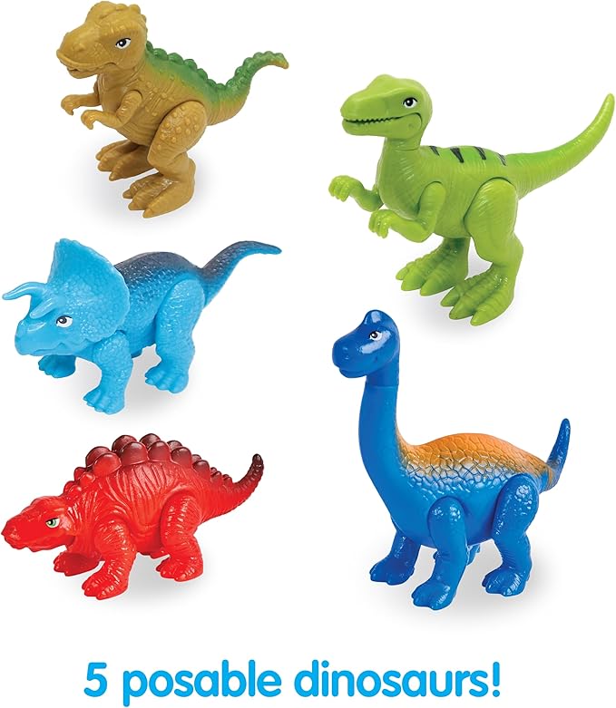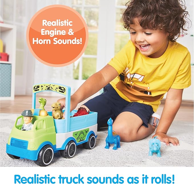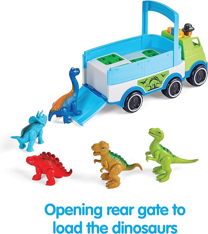 Interactive vehicle and playset with light and sounds! 5 posable dinosaurs with a unique sound effects when placed back in the truck. Sound effects include engine revs, horn and music. Requires 2 "AA" batteries (included).