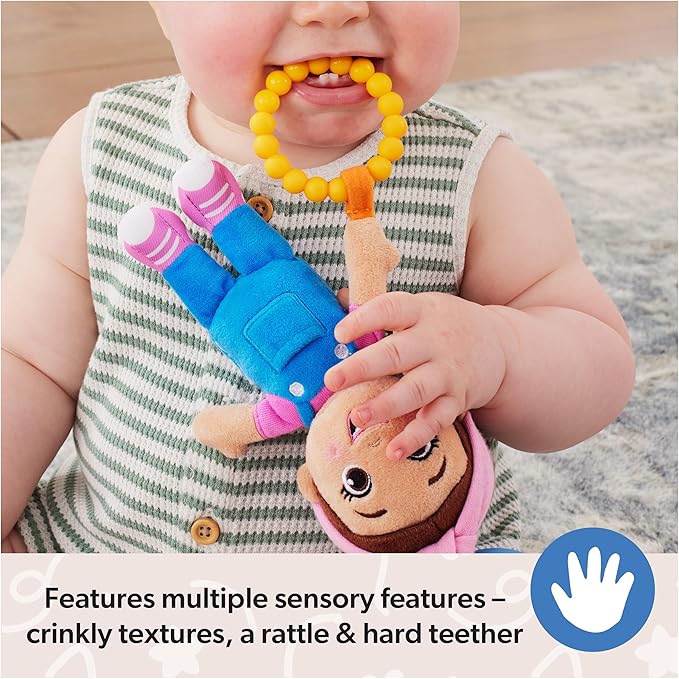 - OFFICIAL MS. RACHEL SENSORY TOYS: Features Ms. Rachel's likeness & multiple sensory features to stimulate early development: crinkly textures, a rattle & hard teether for teething relief in babies 3+ months