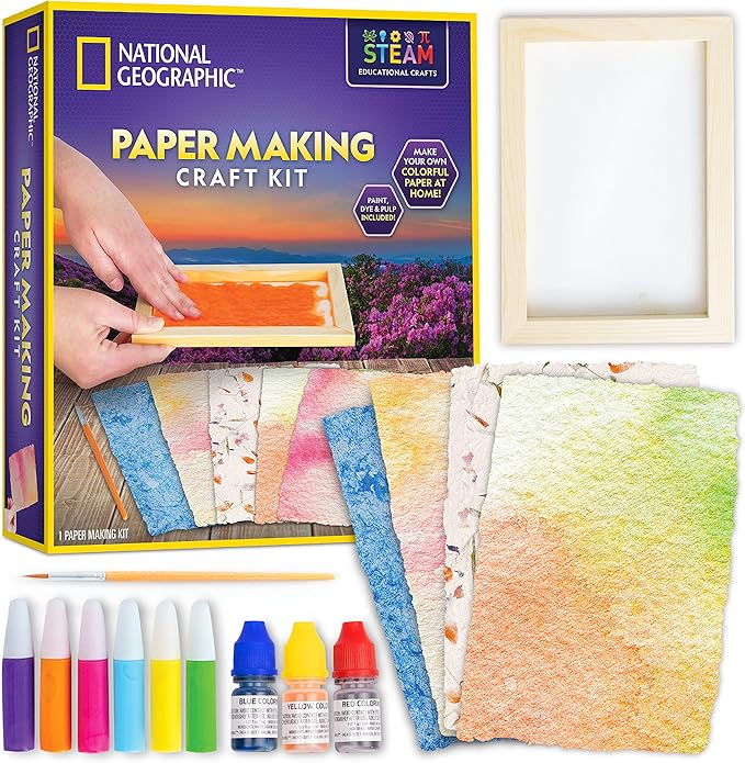 Making your own colorful craft paper at home is fun and easy with the National Geographic Paper Making Arts & Crafts Kit! It contains all the craft supplies, tools, and materials needed to make 10 colorful sheets of paper that can be used for scrapbooking and other kids arts and crafts projects.