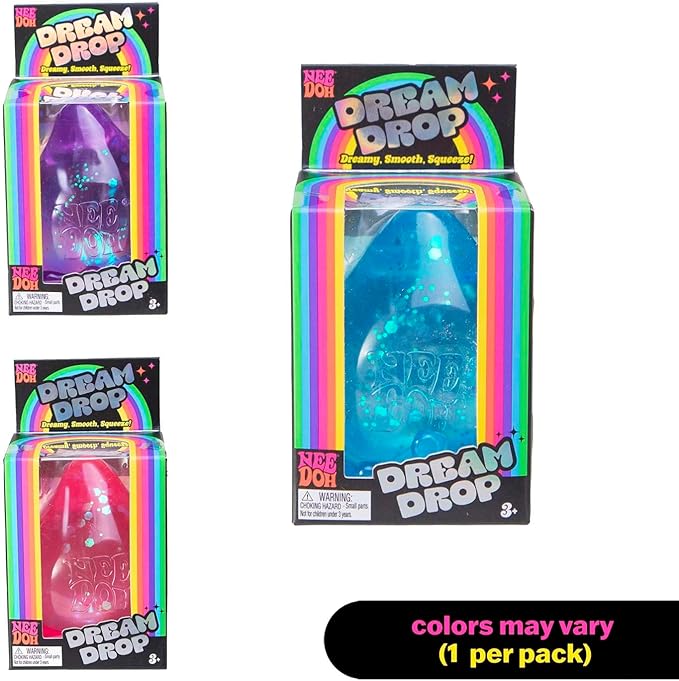 Experience the magical squeeze of NeeDoh Dream Drop with its sparkly filling, perfect for a dreamy relaxation session. Peel off the dynamic splash display stand and choose from various colors - pink, blue, or purple. With a height of 3.25", this playful stress ball is sure to bring a smile to your face.