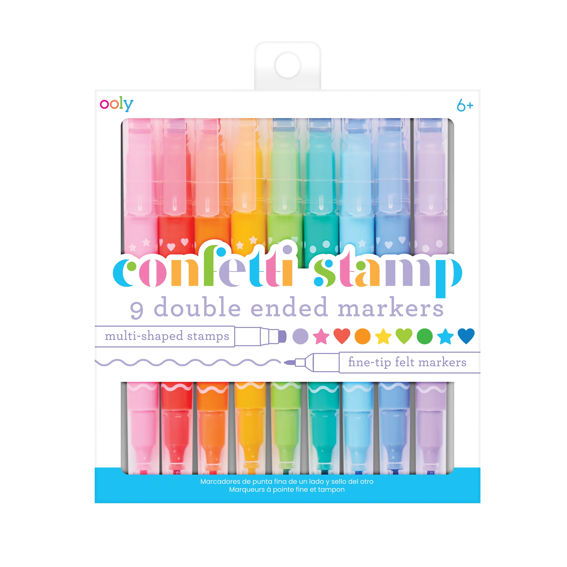 Get ready to stamp, color, and create with Confetti Stamp Double-Ended Markers! This set of 9 double-ended markers brings double the fun to every creative session—each marker has a fine tip on one end for detailed coloring and a confetti stamp on the other for playful shapes. Perfect for coloring books, crafts, and school projects, these stamp markers let kids add bold colors and cute stamped designs to any project. Use them to decorate homemade cards, personalize notebooks, or add fun details to art projects. With shapes like stars, hearts, and smiley faces, each confetti stamp opens up new ways to bring personality to every page.