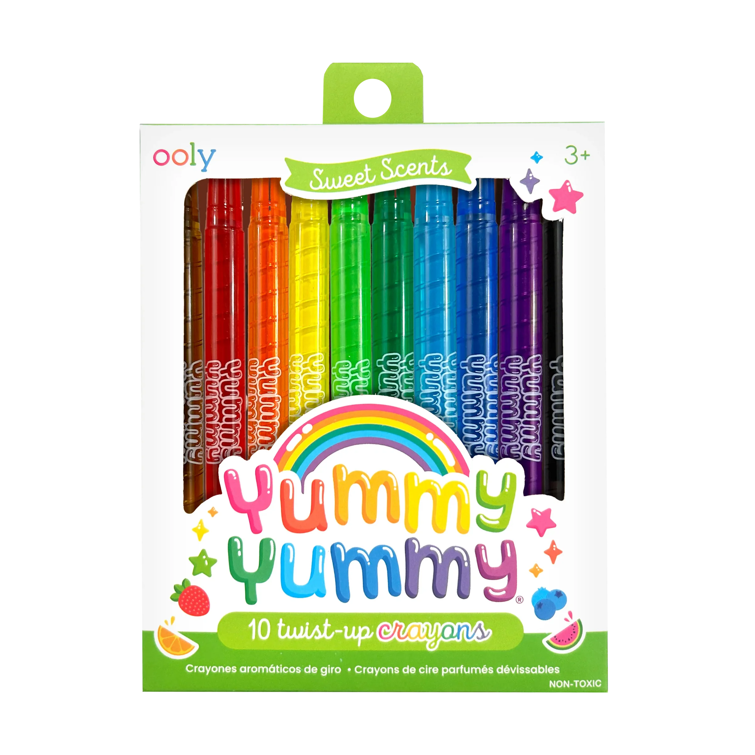 Color and draw with a set of twist up crayons that smell like unforgettably delicious fruit. Yummy Yummy scented twist-up crayons are a set of 10 scented crayons encased in a plastic barrel; just give it a twist when you need more crayon to color with. The durable barrels are a great way to keep little hands clean and protect your crayons from accidental breakage.