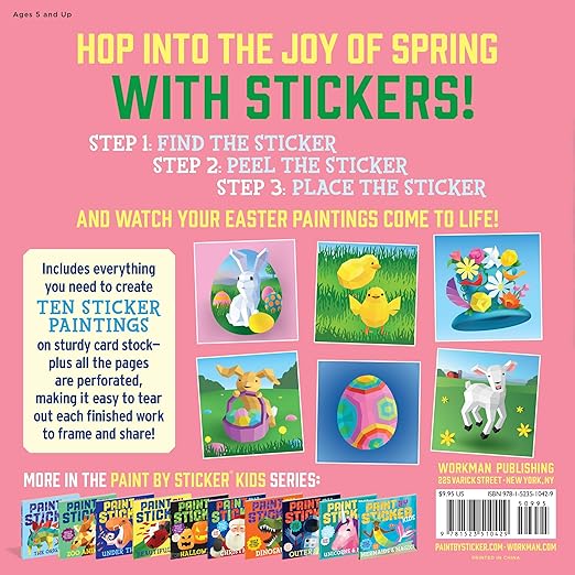 Paint by Sticker Kids: Easter includes everything kids need to create ten festive images, including a bunny with a basket of Easter eggs, a bonnet that’s packed with flowers, spring animal babies, and more!