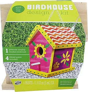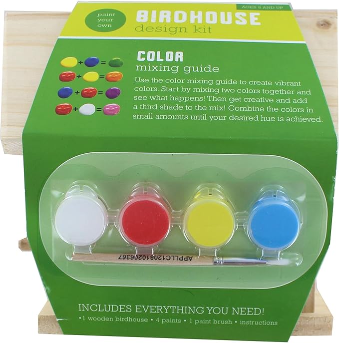 Ages 8 and Up 4 Paints - 0.16 fl oz (5 ml). Paint your own. 1 Premade hanging wooden birdhouse. 4 Vibrant paints included! See back panel for full content details. Includes everything you need! 1 Wooden birdhouse. 4 Paints. 1 Paint brush.