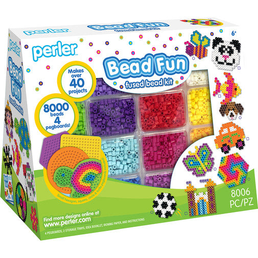 The Perler Bead Fun Activity Kit promises hours and hours of Perler bead fun! This kit includes lots of fun and easy to make projects with enough beads to make over 40 projects. For ages 6 and up. The Perler Bead Fun fuse bead kit includes 8000 Beads, 4 pegboards—small square, small hexagon, small circle and turtle— 2 storage trays, ironing paper and an idea booklet. Bead colors include white, yellow, orange, red, purple, dark blue, light blue, dark green, light green, brown, grey, black, clear, light brown, peach, magenta, purple glitter, neon orange, neon green, pastel blue, pastel lavender, pastel yellow, cheddar, toothpaste, hot coral, plum, kiwi lime, turquoise, transparent turquoise, green, pink, and prickly pear.