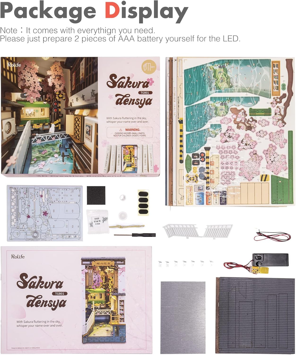This charming dollhouse kit captures a romantic spring scene in Japan, with a tram and cherry blossoms. Assemble 340 pieces for a calming experience, including all necessary accessories. This wooden book nook adds a playful touch to any bookshelf and can even be used as a night light. Its intricate design will amaze you. The perfect gift for anyone who loves to create with their hands.
