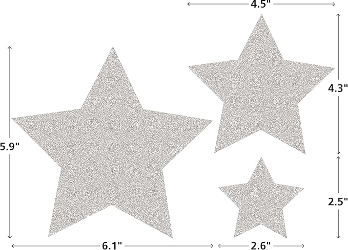 Use the Silver Glitz Stars Assorted Sizes Accents to dress up classroom walls and doors, label bins and desks, or accent bulletin boards. 30 per pack in 3 sizes: (10) 6", (10) 4½", (10) 2⅝".