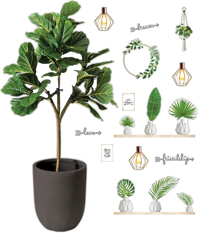 WHAT'S INCLUDED: Spruce up your space with this 26-piece boho bonanza! Enjoy a 7-piece potted plant, 6 funky vases, a swinging hanging basket, 3 dangling pendant lamps, 2 framed motivational signs to make you smile, 3 word accents that pop, a whimsical wreath, and 3 wooden shelves for all your treasures! FEATURES: This bulletin board set spreads good vibes with inspirational messages that make your classroom a happy place, reminding kiddos about love, dreams, friendship, and other heart-warming stuff! DIMENSIONS: Pieces range from itty-bitty 3.66 x 5.2 inches to a whopping 32.65 x 63.7 inches when you put all 7 pieces together like a puzzle!