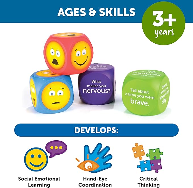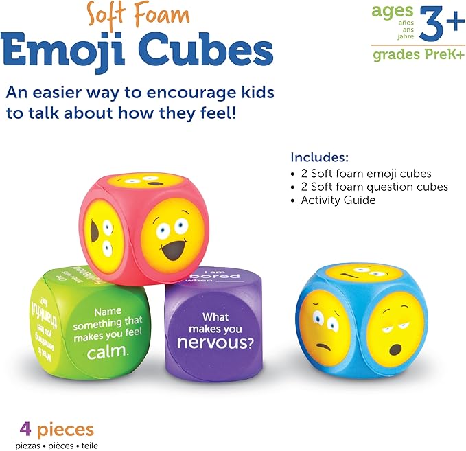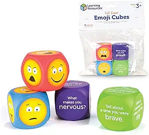 Dice-like soft foam cubes help kids relate words to feelings with depictions of common emotions