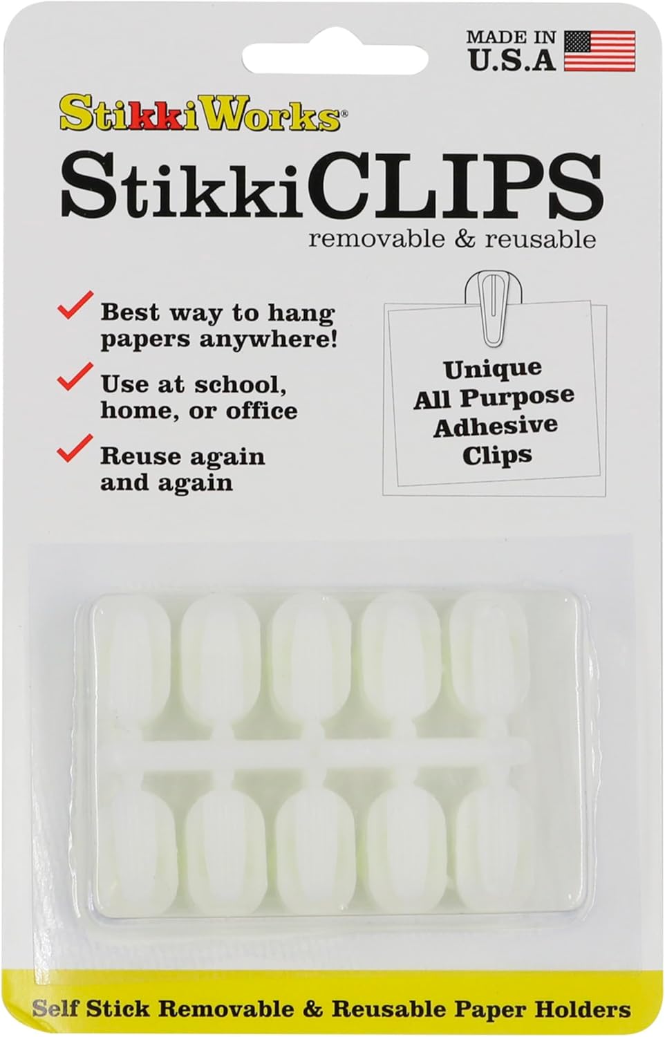 StikkiWorks Stikki Clip is a better substitute to tacks, push pins, glue, tape and staples. Standard clip sticks to any surface and can be used over and over again. It removes with just a twist and the adhesive will not stain or damage surfaces and will never dry out. Waterproof and non-toxic. Use on wallboard, cinder block, brick, plaster, paneling, pegboard, concrete, metal, glass, plastic, wallpaper, tile and almost anything else. Pack of 20 clips.