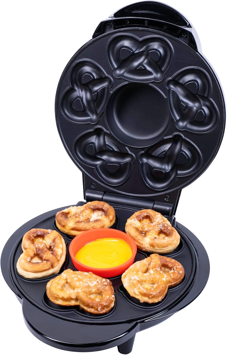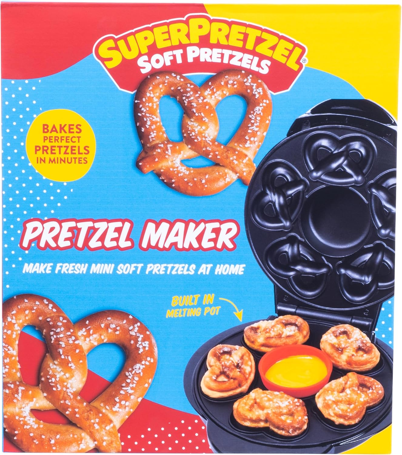 Get ready to twist, dip, and indulge with the SUPERPRETZEL Maker! Whip up five soft pretzels with the built-in melting pot for a deliciously cheesy twist on tradition. Perfect for parties or a fun snack time. Just add the Fizz Creations Baking Kit (Sold Separately) for a super-twisted treat. Officially licensed by Fizz Creations.